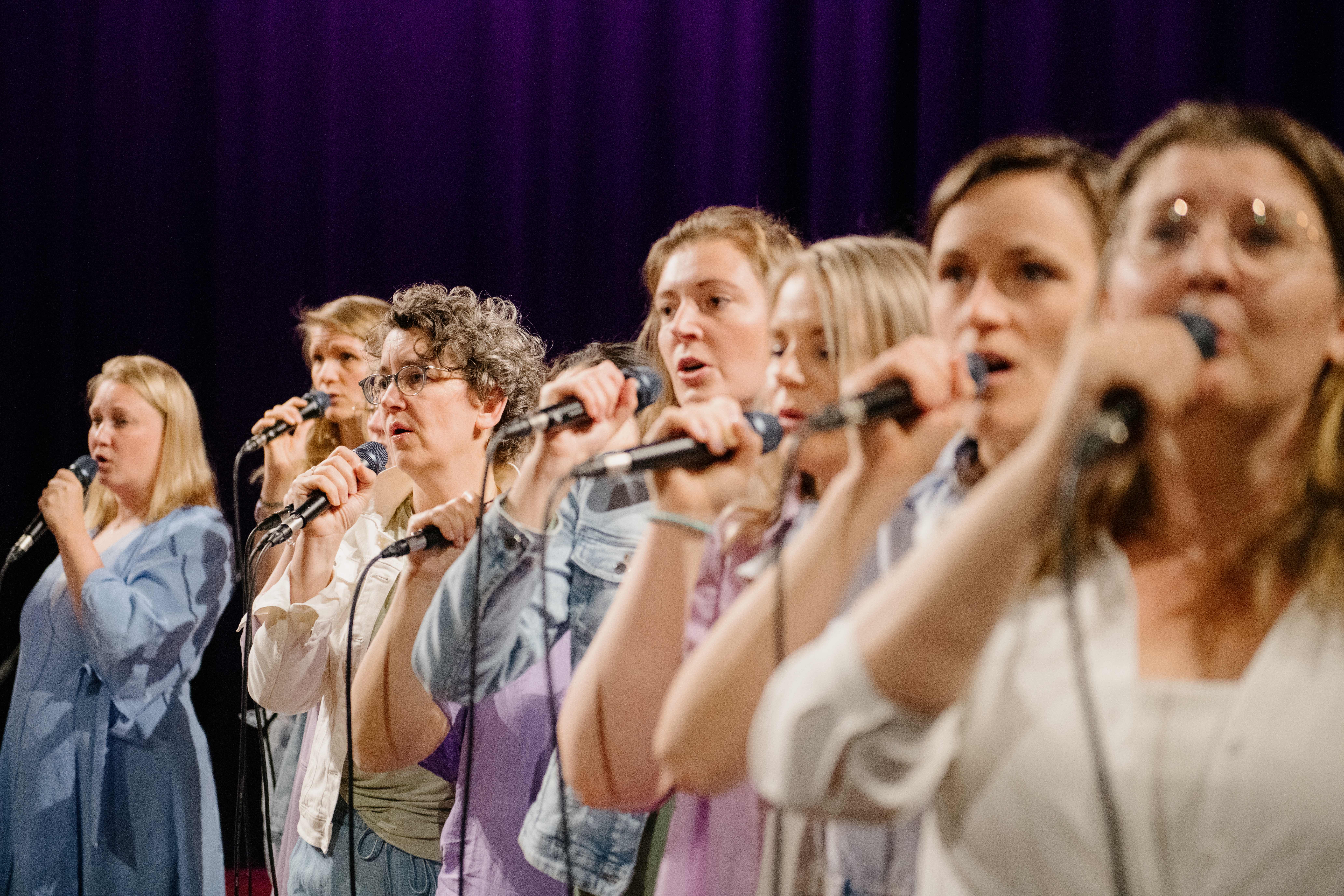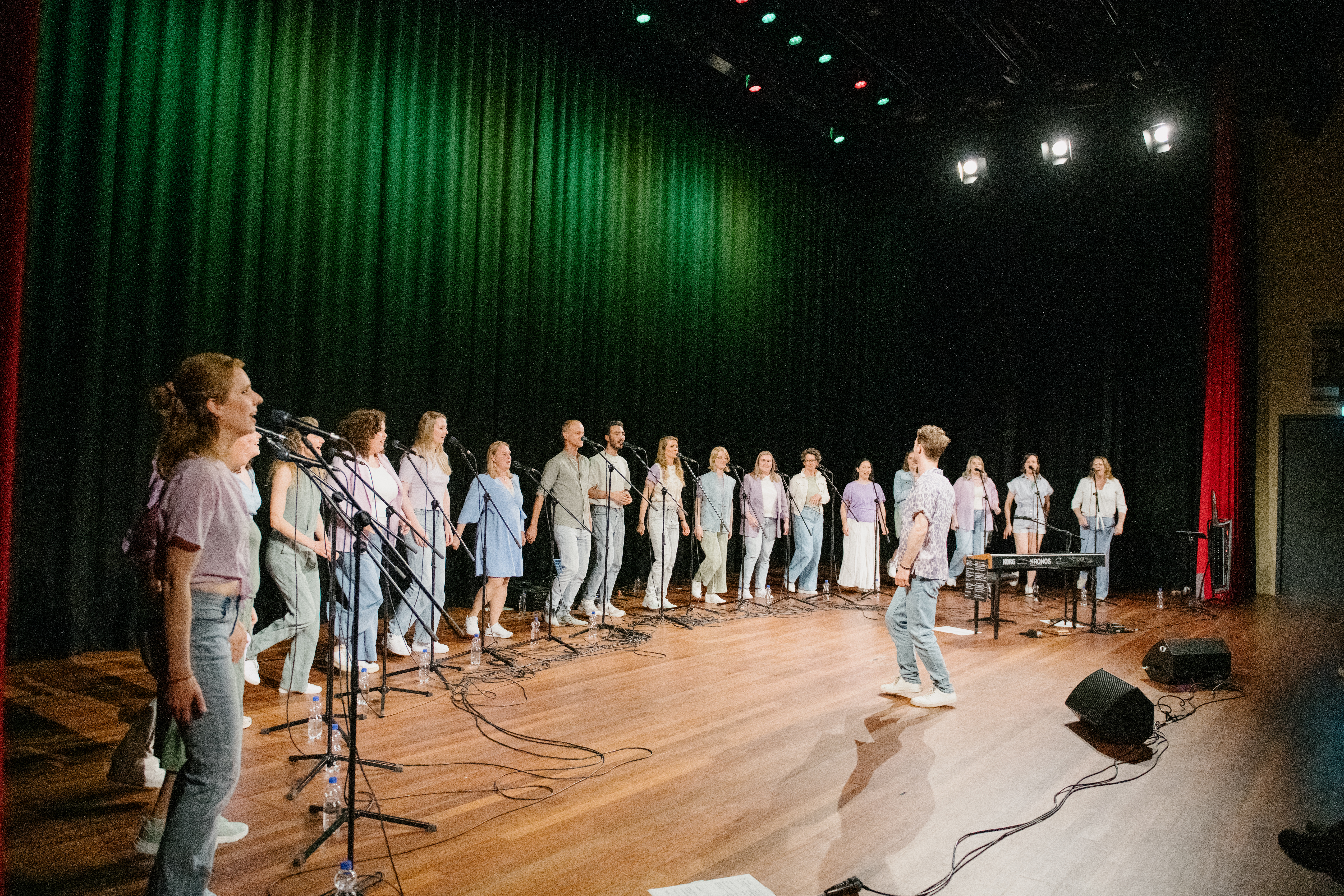 De zangers van Wired Voices repeteren en zingen elk met een eigen microfoon.